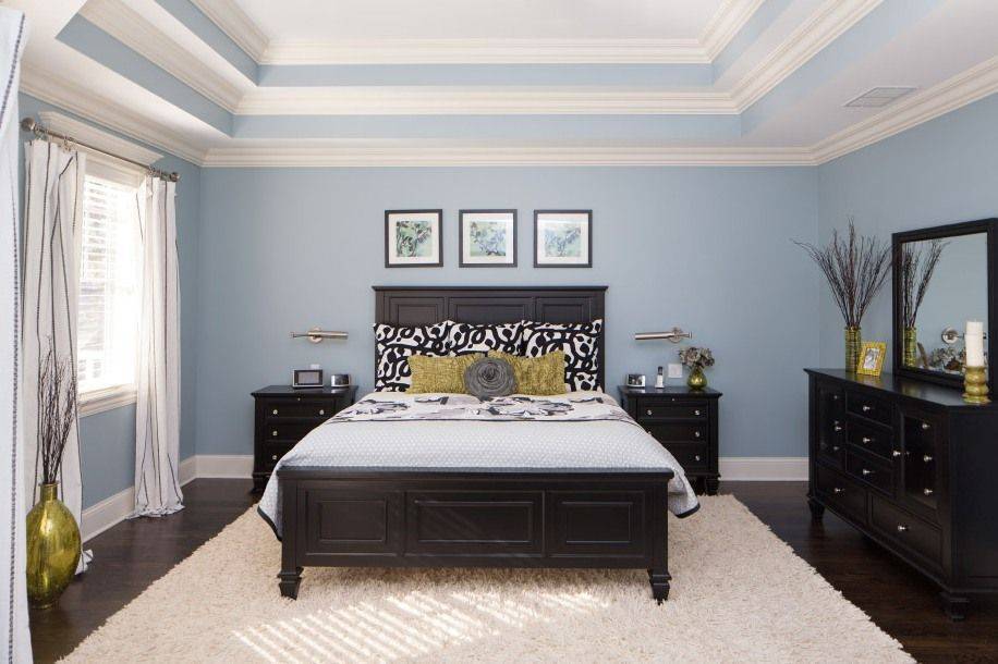 Небесные тона придадут спальне объём, жёлтые и оранжевые – визуально сузят пространство. Зелёный, серый, красный – эти цвета абсолютно никак не влияют на то, как будет восприниматься помещение. Поэтому их можно применять без опаски.
