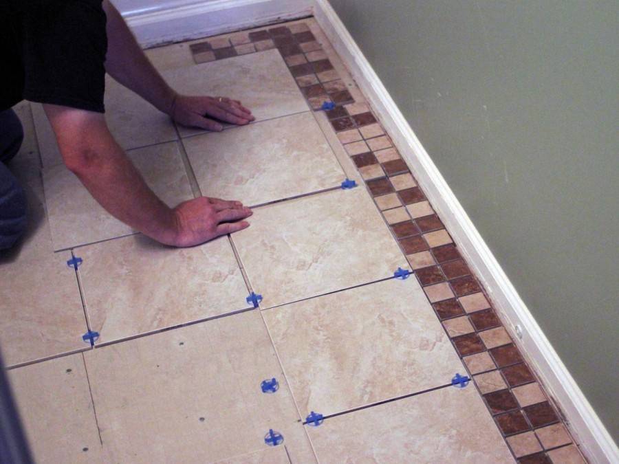 Способы укладки плитки на пол гораздо более простые, чем на стены, так как на поверхности отсутствуют люки. Укладка происходит по 3 варианту, описанному в нашем примере. Вычисляем количество целых рядов, отнимаем 1 и начинаем делать укладку от центра с целой плитки, по краям получаем 2 равномерных подрезки.