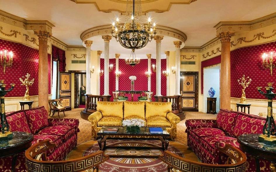В цветовой палитре комнат преобладают светлые и золотые оттенки, которые максимально подчеркивают торжество роскоши. Красные и синие цвета выполняют вспомогательную функцию — выделяют на общем фоне важные второстепенные детали обстановки.