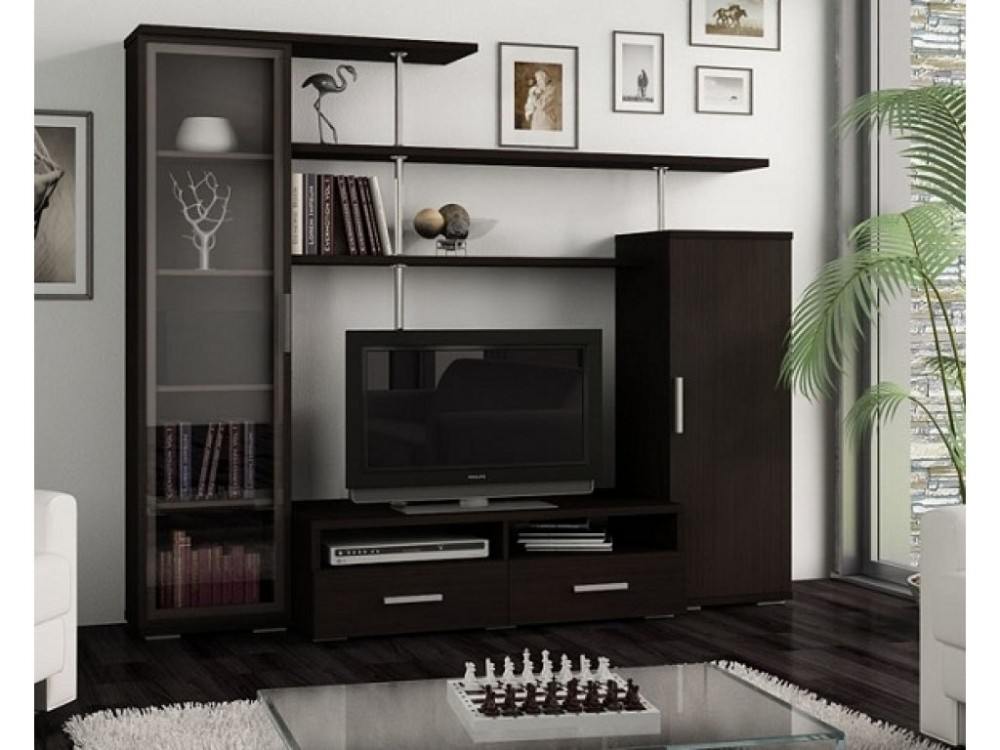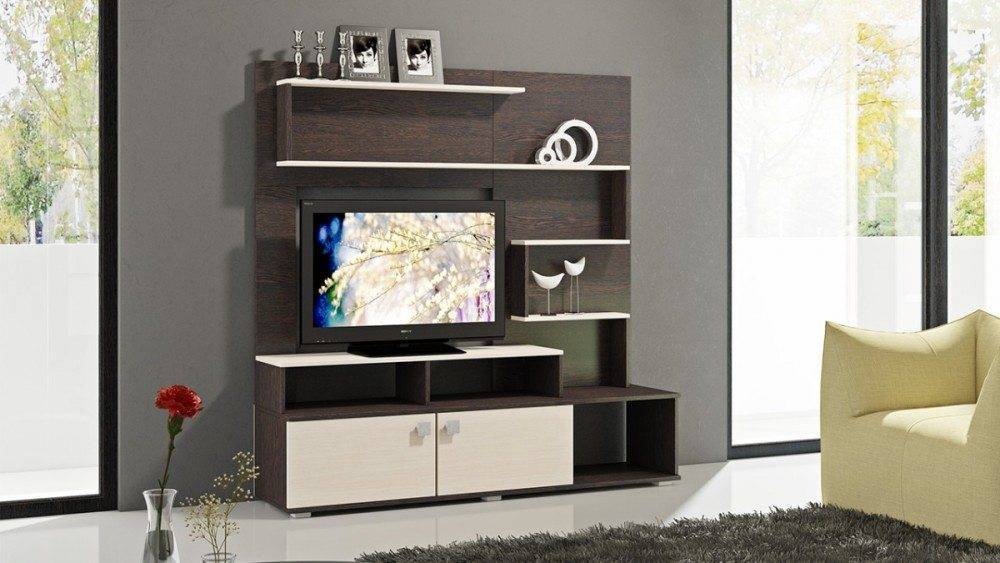 - мини-стенка или мини-горка для ТВ – решение для небольших гостиных. Гарнитур фактически служит обрамлением для телевизора, отсюда и название. Как правило, состоит из тумбы, полок и нескольких шкафов или пеналов. Это частный случай обычного прямолинейного гарнитура.