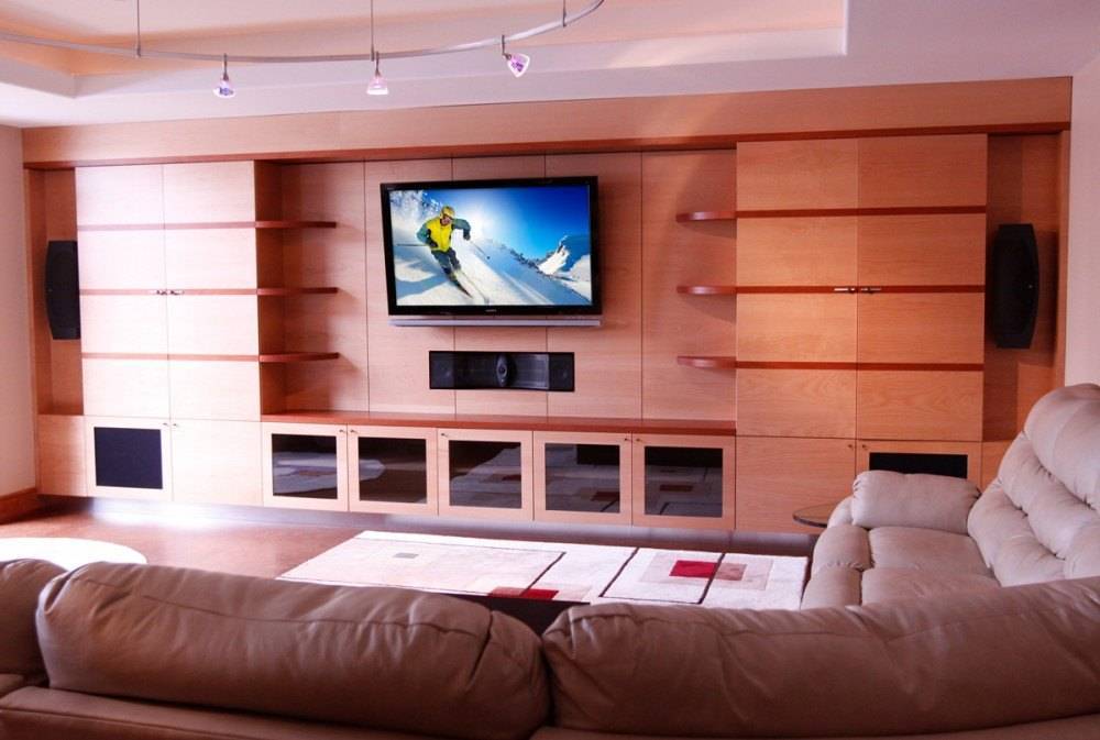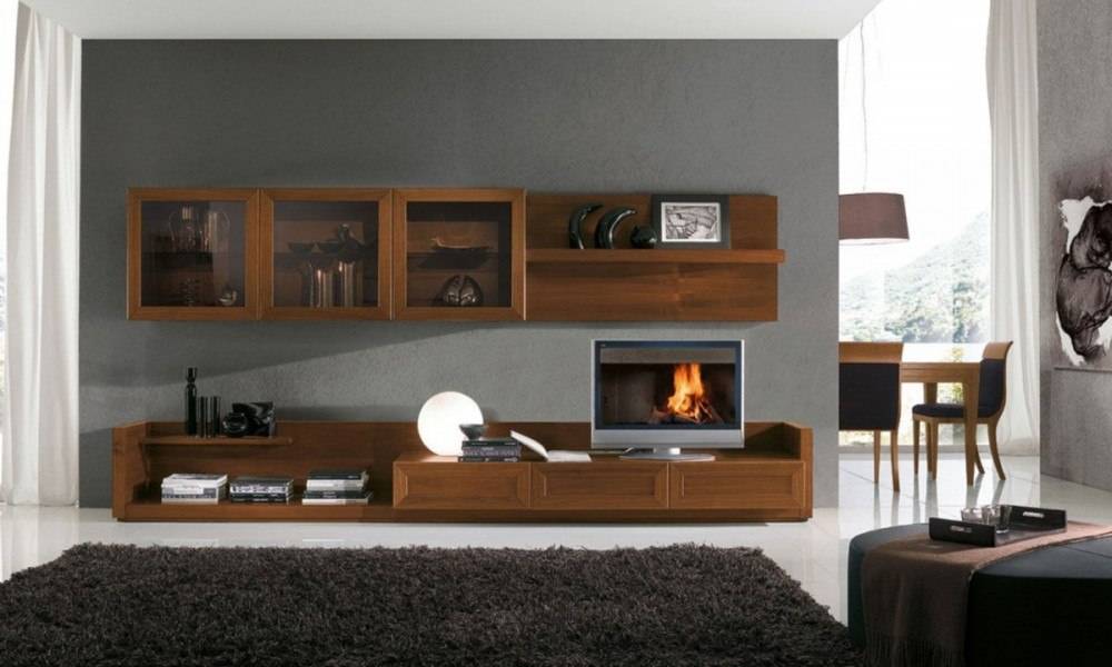 Достаточно популярными считаются комбинированные изделия со встроенным камином или рабочей зоной с выкатным, выдвижным письменным или компьютерным столом, который может использоваться только в случае необходимости. Такое решение особенно уместно для зала, имеющего скромную площадь.