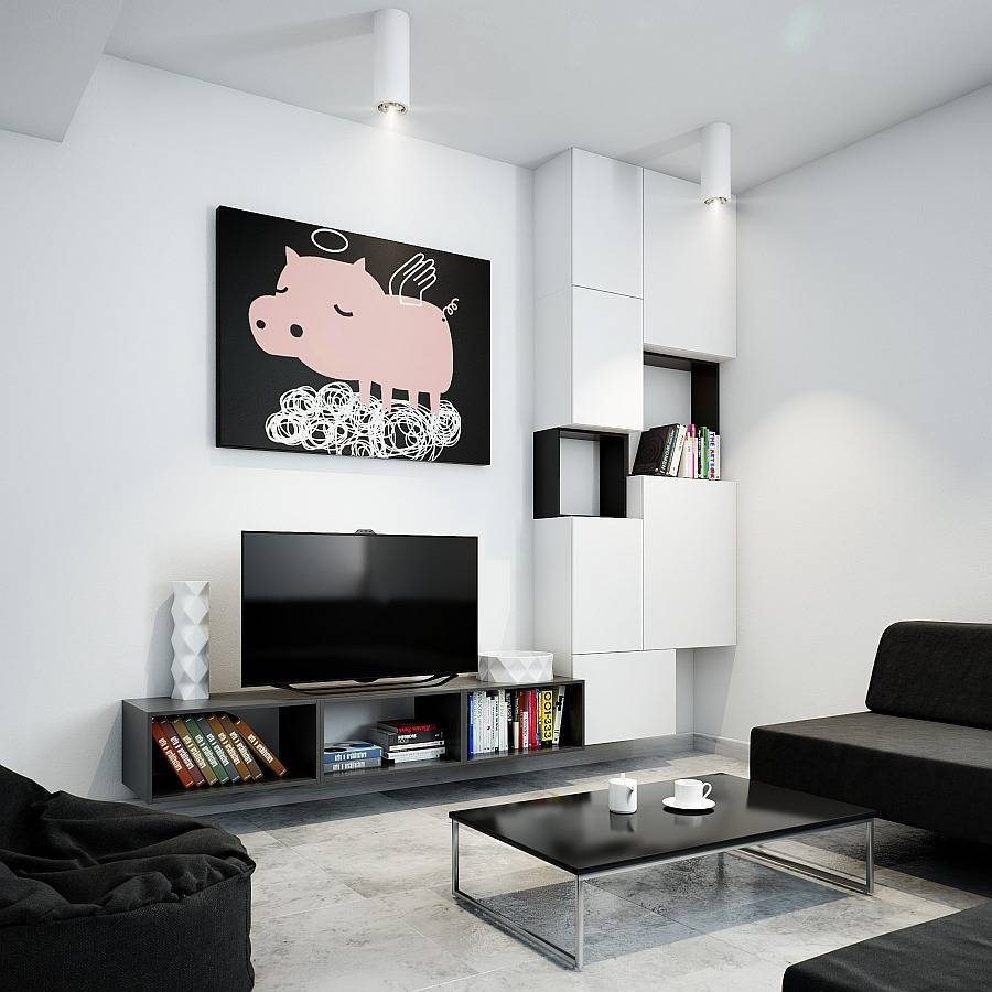 Чёрно-белые сочетания давно помогают владельцам квартир обустроить свои гостиные в оригинальном виде. Удачным считается компоновка белого цвета с любым тёмным, глубоким цветам. Белые модули отлично возьмут на себя основное направление. А тёмные оттенки вишневого, коричневого, серого или зеленого цвета придадут шарм