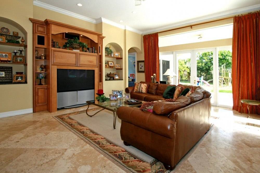 - Конструкции светлых нейтральных цветов (кремовый, бежевый, светло-коричневый) хорошо впишутся в гостиную с ярким декором.
