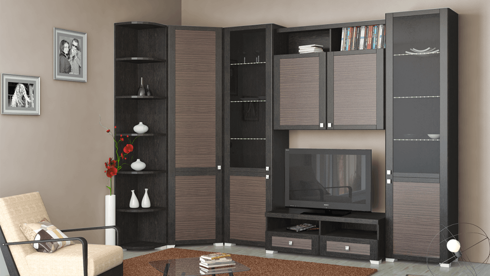 Угловые. Если зал небольшого размера, то приобретение такой стенки позволит сэкономить площадь. Поэтому такие конструкции имеют спрос.