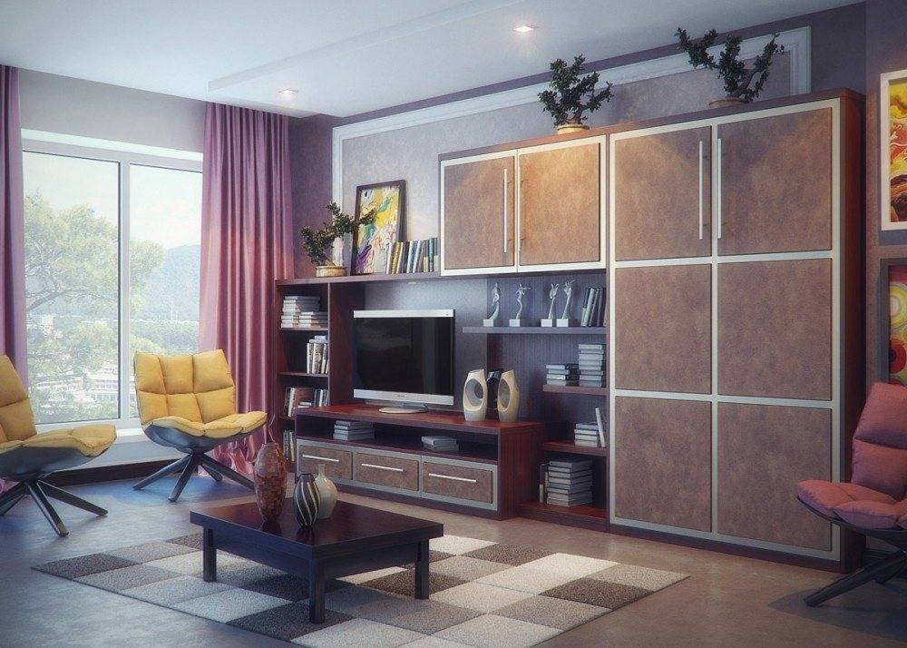 Благодаря трансформирующейся мебели, удается оптимально разгрузить гостиную и придать ей больше функциональности. Комплексная стенка-трансформер, объединенная с кроватью или диваном, станет идеальным решением для маленького зала или однокомнатной квартиры.