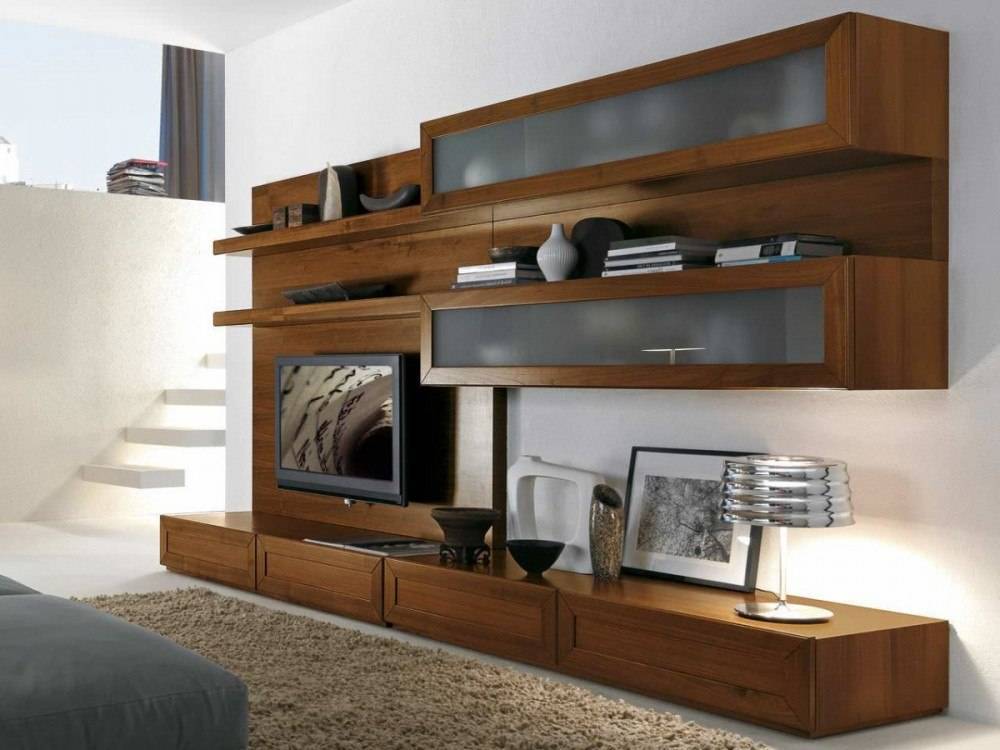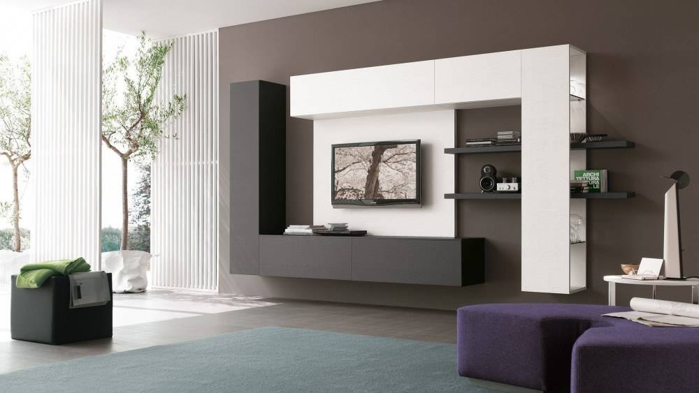 Интересно выглядят ассиметричные формы модулей. Это модно и красиво. Различная высота, ширина, форма шкафчиков, дверей, стеллажей позволяет составлять эксцентричные композиции и придавать гостиной нужное настроение.