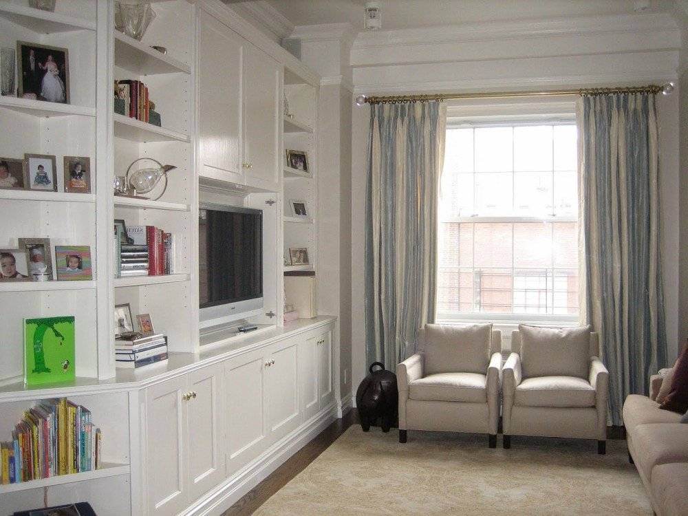 Нередко в интерьере устанавливают стенку возле окна. Такие варианты создают по индивидуальному заказу с учетом особенностей помещения. Но в целом конструкции имеют широкий функционал. Кто-то размещает здесь небольшую гардеробную, другие оборудуют домашнюю библиотеку, а третьи используют стенку для хранения всех необходимых вещей и документов.