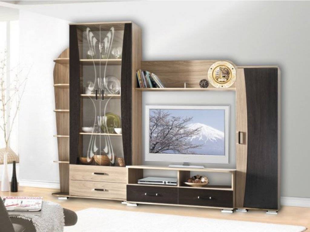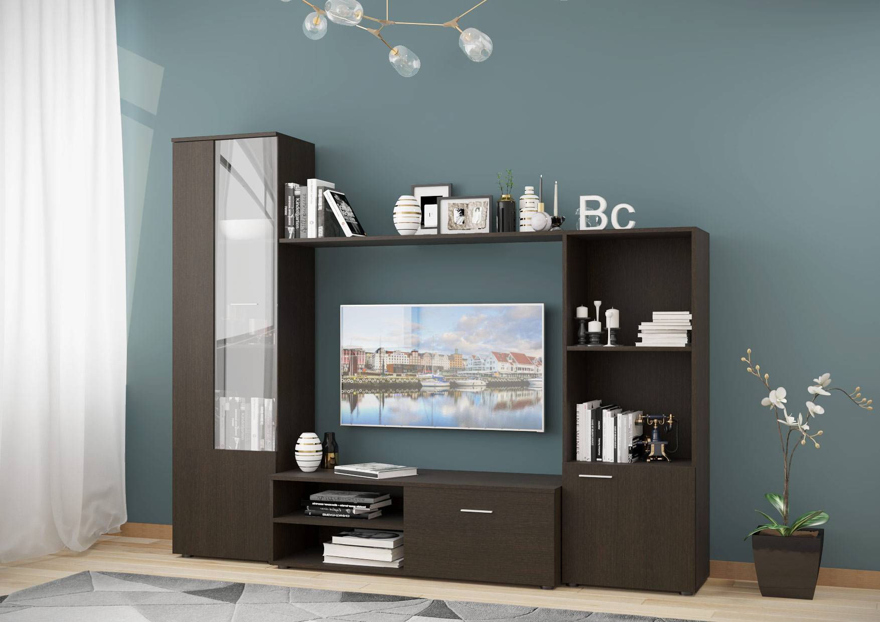 - Маленькие. Буквально состоящие из нижнего блока (подставки под телевизор) и нескольких полок сверху. В основном представляют собой модульную конструкцию. К ним относятся и мини-стенки.