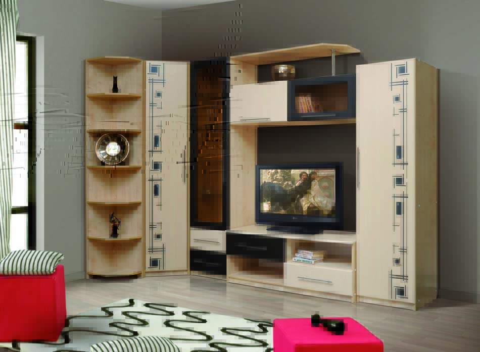 Если хотите угловую стенку, можно выбрать модель с узкими шкафами, чтобы не загромождать сильно помещение. Попробуйте подбирать в тон к шторам или, например, подушкам дивана.