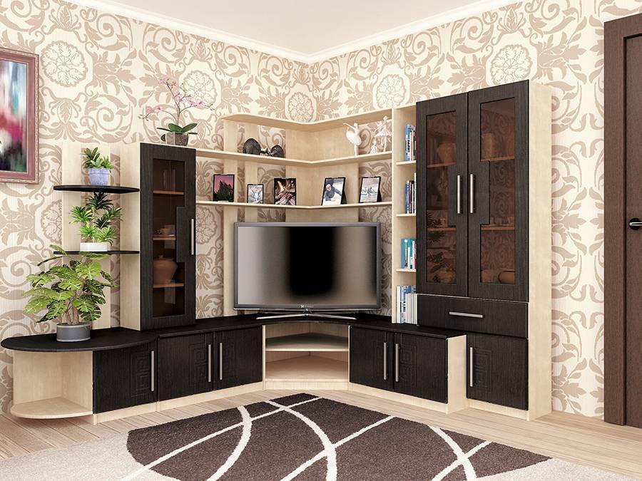 Угловые модели можно подобрать для разных интерьеров. Они отличаются универсальными фасадными элементами, которые можно изменять по желанию. Открытые полки великолепно дополняют обстановку. Превосходно выглядят выгнутые фасады с декором в виде стекла. Если соединить разные конструкции, то можно сделать роскошную композицию. Существуют также многофункциональные стенки в гостиную с компьютерным столом.