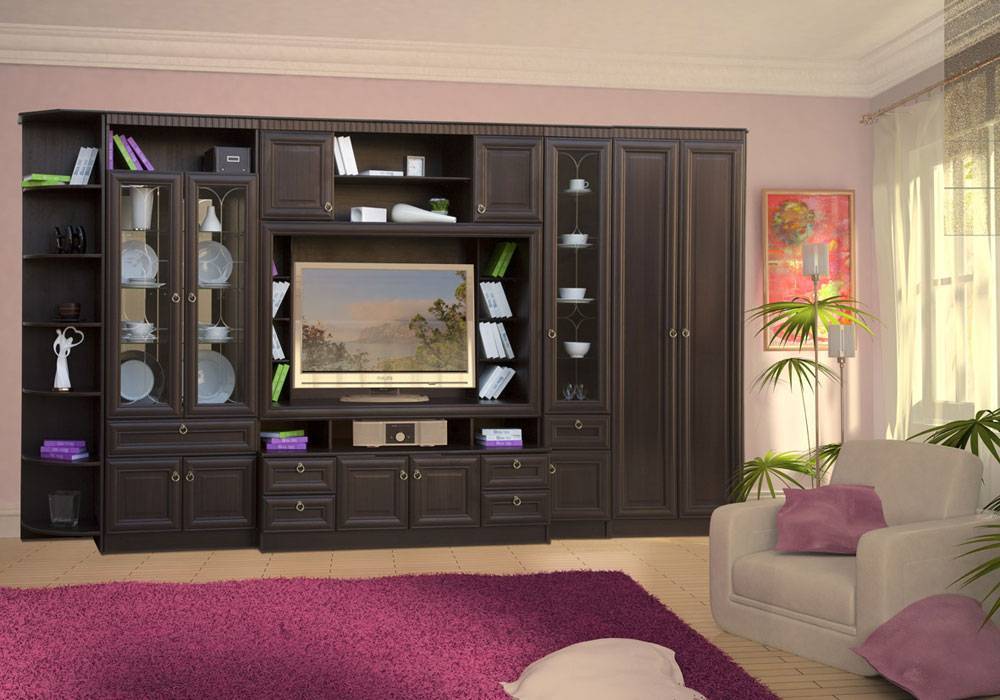 Выбор классических линейных стенок велик, остановиться на подходящей не составит труда. Также подойдет мебель в стиле прованс с изящными линиями и отделкой под старину. Эффектно и роскошно будет смотреться электрокамин.