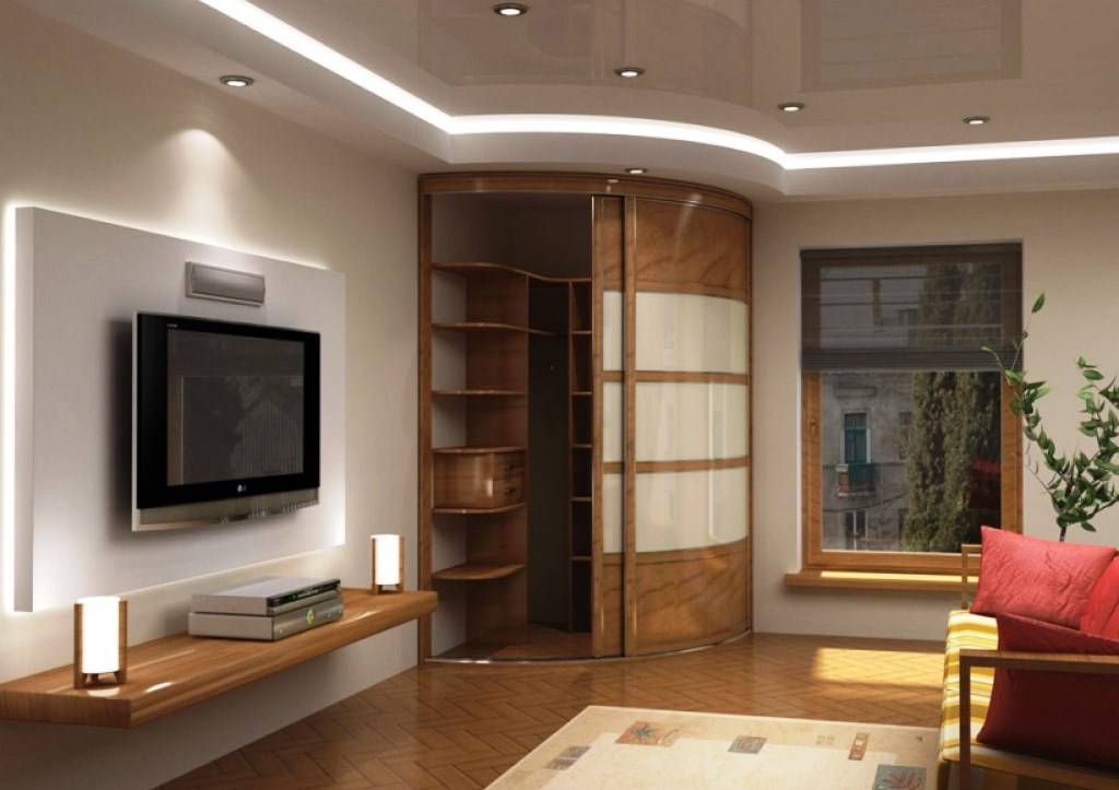 - форма и стиль — эти качества зависит от стиля интерьера гостиной. Главное чтобы шкаф отлично вписывался в стиль, придавал комнате оригинальность, функциональность.