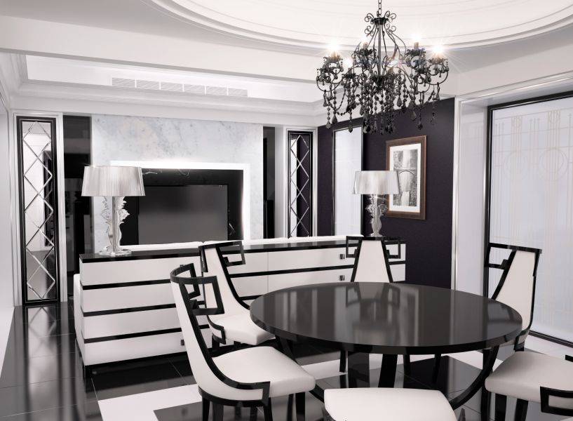 - Цветовая палитра. Классическим для данного стиля является сочетание черного и белого цветов. Когда отходят от канонов, то делают выбор в пользу благородных оттенков — изумрудного, сапфирового, рубинового, золотого. Насыщенная палитра обычно используется для оформления отдельных мелких и средних элементов интерьера и не является базовой.