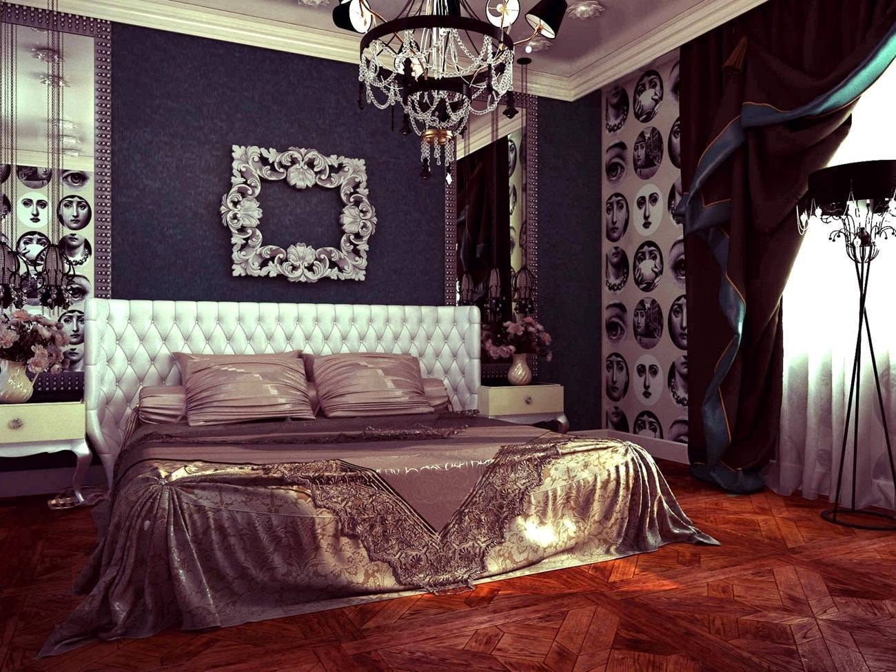 Оригинальность оформления спальни позволяет использовать большое количество зеркал, достаточного числа осветительных приборов, применение контрастов. Кроме этого, в отделке допустимо использование: