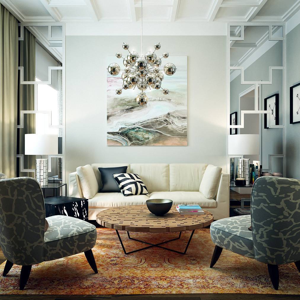 Еще один важный момент — преувеличение масштабов. Ар-деко выглядит величественно за счет крупных предметов мебели и искусства: признаки ар-деко — это, например, массивная люстра посреди потолка. Если вам удастся создать в помещении многоступенчатость, многослойность за счет архитектурных решений (потолок сложной формы, ниши в стенах), то будет вообще здорово.
