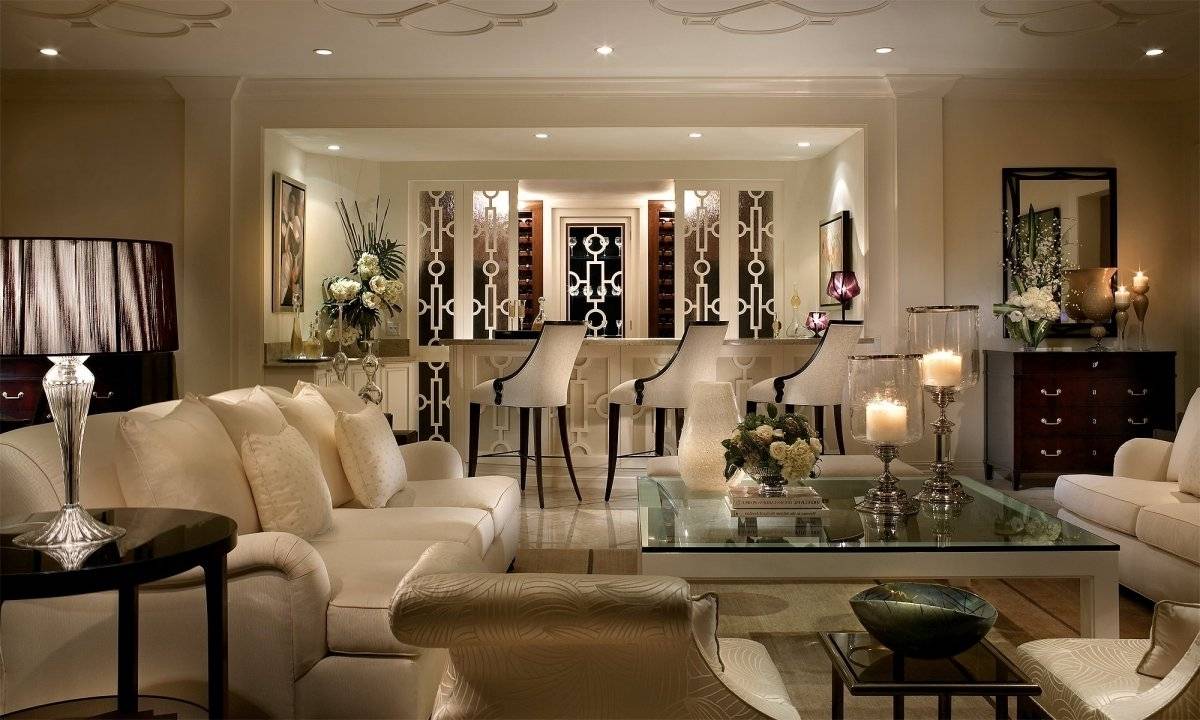 Бывают смелые сочетания черной мебели с белыми стеклами, диванов и кресел самых обычных размеров с одновременной пышностью и объемом форм. В обивке мебели, шторах и обоях должно быть идеальное сочетание.