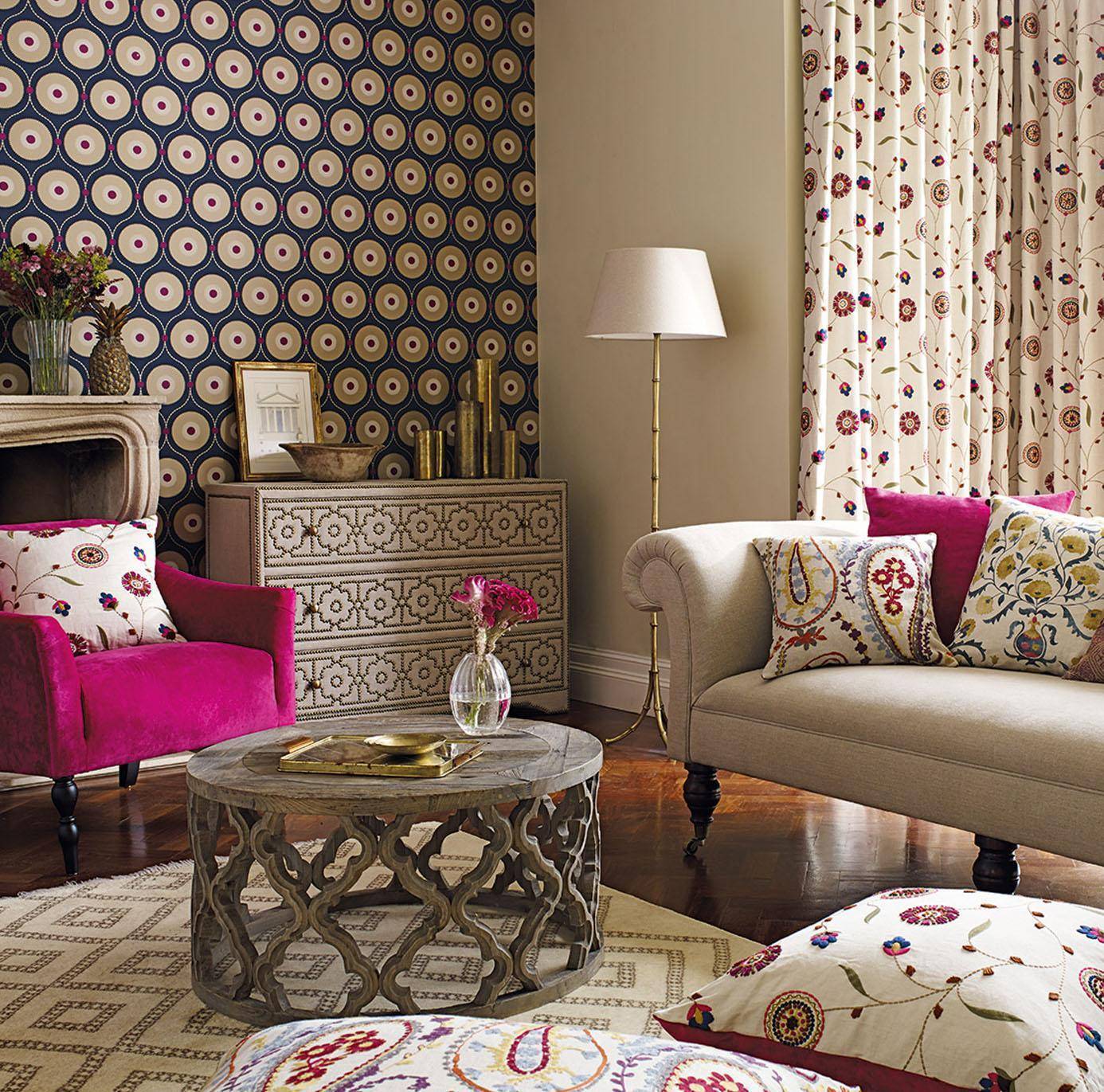 Гостиная в стиле бохо с деревянным резным столиком