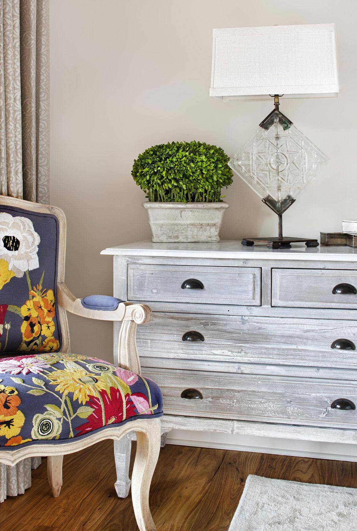 Ванная в стиле бохо делает акцент на винтажной мебели (комодах и шкафчиках) и современной сантехнике.