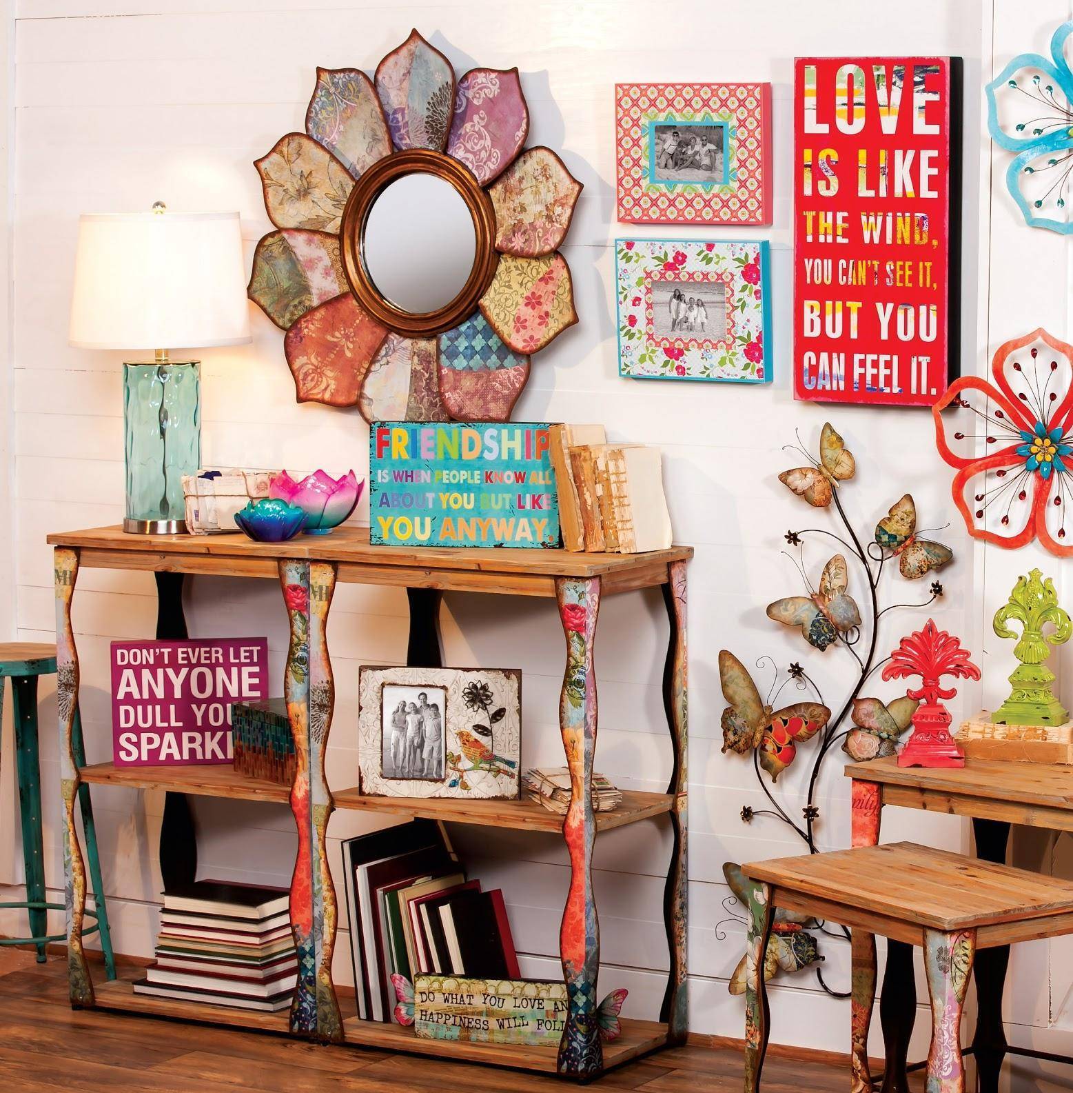 Стиль бохо призывает владельцев вспомнить и поставить на показ все наиболее привлекательные и дорогие для души элементы: статуэтки, шкатулки, торшеры, книги, пластинки, любимые фото, картины и другие мелочи, которые пылятся на антресолях. Являясь полной противоположностью минимализма, бохо настолько гармонично выставляет большое количество вещей, что они уже не воспринимаются как не нужные вещи. Именно поэтому он идеально подходит для творческих натур, показывающий богатый душевный мир своего хозяина и всё то, с чем он работает практически каждый день.