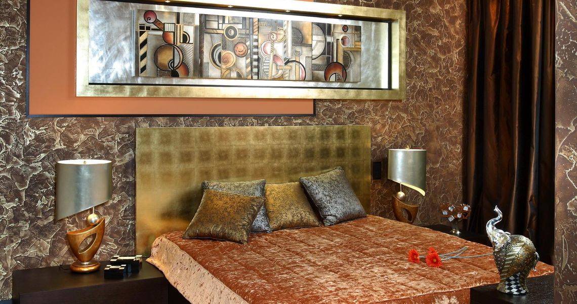 - Роскошные отделочные материалы. Стены в Арт-деко — это целое искусство. Их расписывают этническими узорами, создают симметричные композиции, украшают картинами, предметами экзотической тематики и яркими акцентами. Для пола идеальными вариантами являются полированный мрамор и гранит. Потолок традиционно белый, но не лишен современных возможностей освещения.