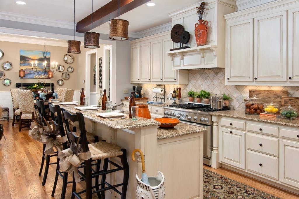 Сегодня в тренде выделение обеденной зоны, поэтому можно повесить роскошный светильник над столом. Рабочую зону тоже необходимо хорошо осветить, в этом помогут точечные светильники.