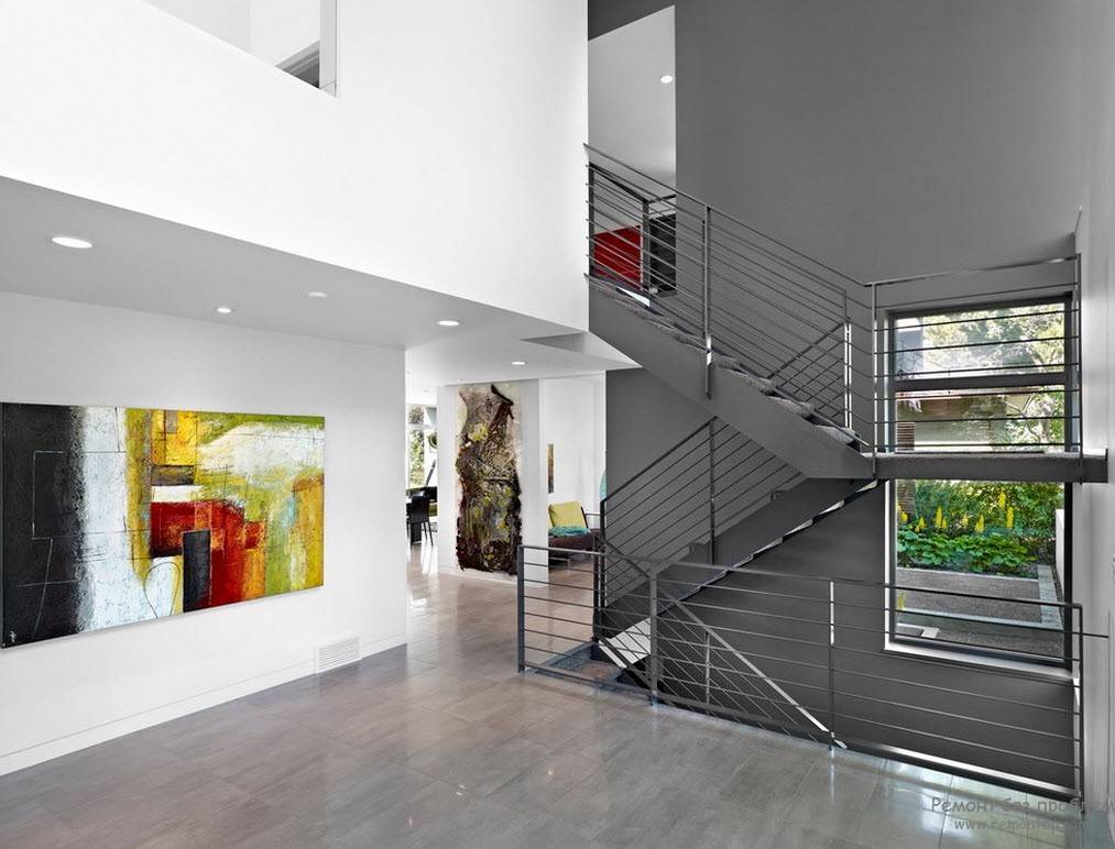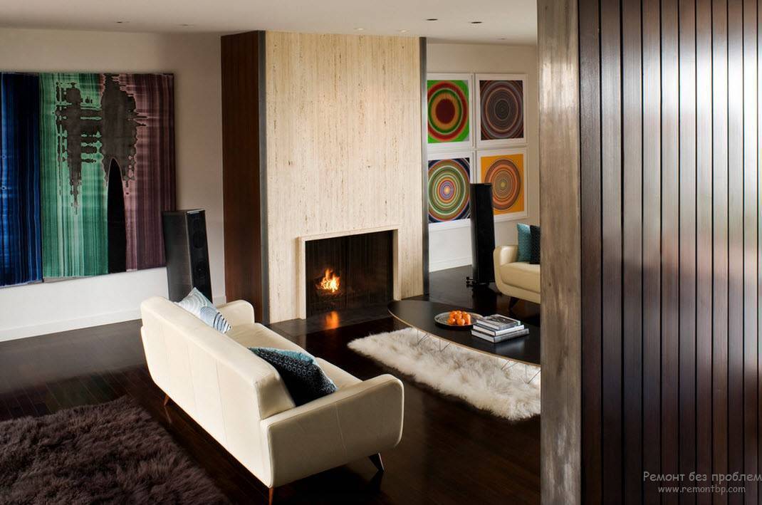 Тогда его дополняют яркой дорожкой, ковром или шкурой. Или же он может быть художественно оформлен (наливной пол с рисунком, художественный паркет или мозаика). В этом случае его ничем не закрывают, позволяя гостям любоваться интерьерным чудом.