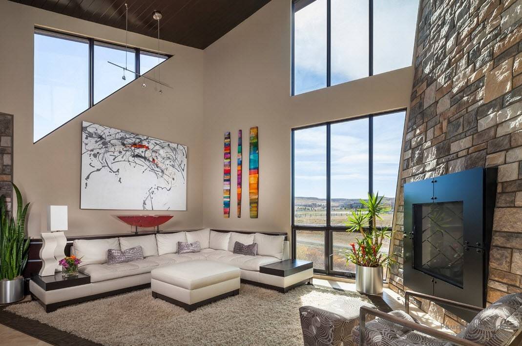 Как и в интерьере в стиле поп-арт, очень популярно так называемое «зонирование» помещения. Оно заключается в покраске стен различными цветами и отделке разными материалами. Например: одна стена может быть окрашена в яркий цвет, а остальные две в более нейтральные. Четвертую стену, в свою очередь, можно отделать камнем либо деревом.