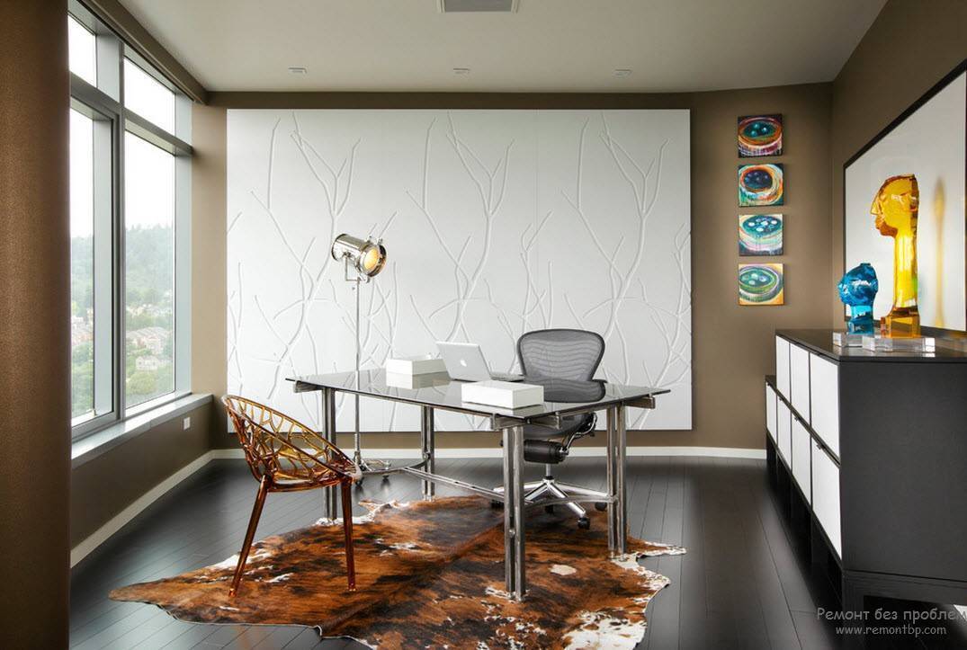 В нем используются те же элементы стиля фьюжен: контрастность цветов, обязательное присутствие белого, оформление стен из разных по виду, свойствам материалов, кроме камня. Но здесь все же должно быть более аскетичная обстановке. Ничто не должно отвлекать от работы. Только необходимое. Не исключены предметы старины. Ввиду ограниченности пространства (под кабинет обычно используется небольшая комната) разно уровневость поверхностей будет лишней.