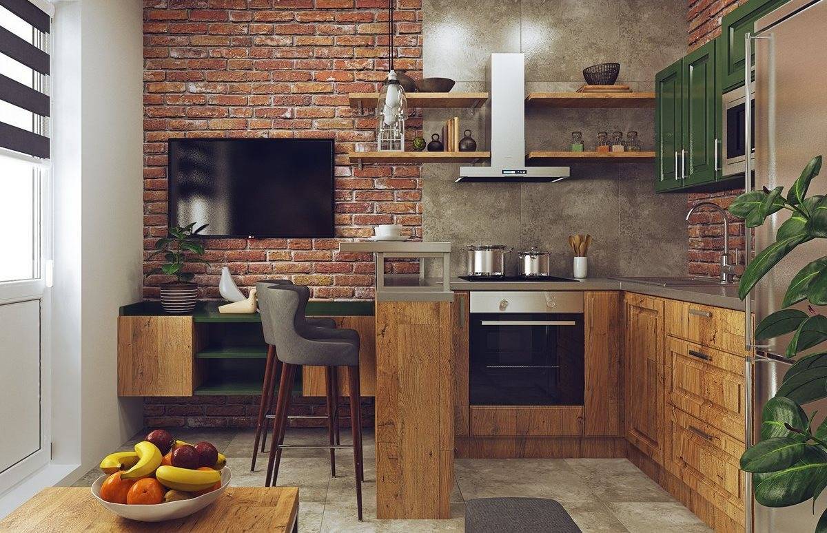 Стены на кухне оформляют из кирпичной кладки, штукатурки, керамики или просто окрашивают.