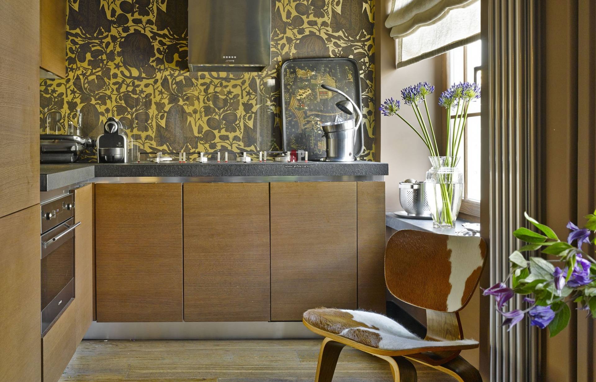 В рабочей зоне может быть плитка или кладка из кирпича или камня, в обеденной – обои, краска или фотообои. Также стены кухни могут быть полностью покрыты штукатуркой, при этом две любые стены выделяют с помощью другой фактуры или цвета.