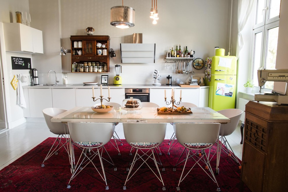 На современной кухне для контраста можно установить ретро-холодильник и тостер. Точно так же будут работать красный холодильник и чайник на фоне белоснежного классического гарнитура. Вариантов можно придумать сотни, от желтого бархатного кресла на фоне мебели в духе хай-тек и кирпичных стен до комплекта из разноцветных пластиковых (деревянных и прозрачных) стульев у обеденного стола, как в примере на фото.