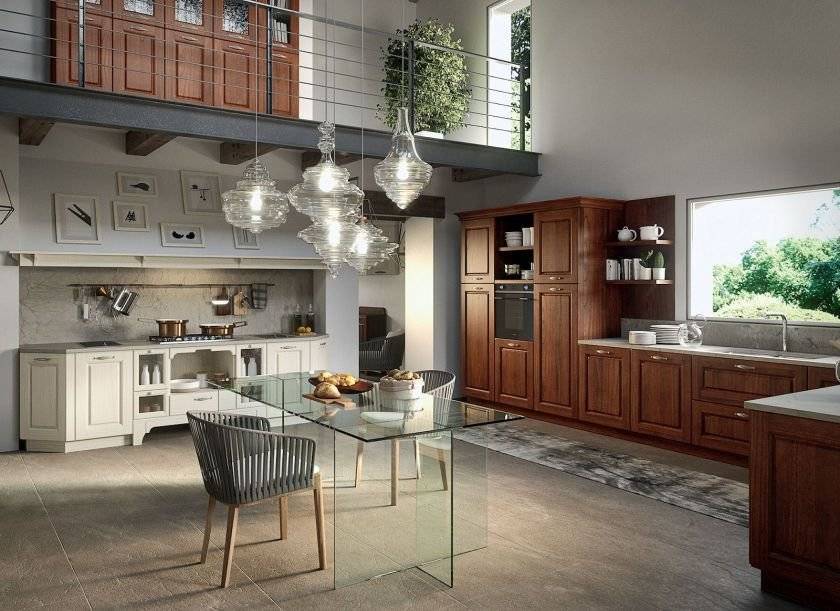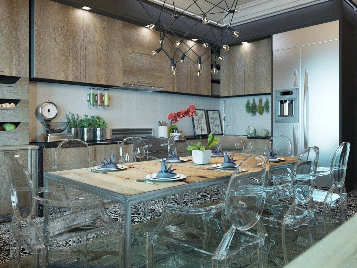 Сегодня в тренде выделение обеденной зоны, поэтому можно повесить роскошный светильник над столом. Рабочую зону тоже необходимо хорошо осветить, в этом помогут точечные светильники.