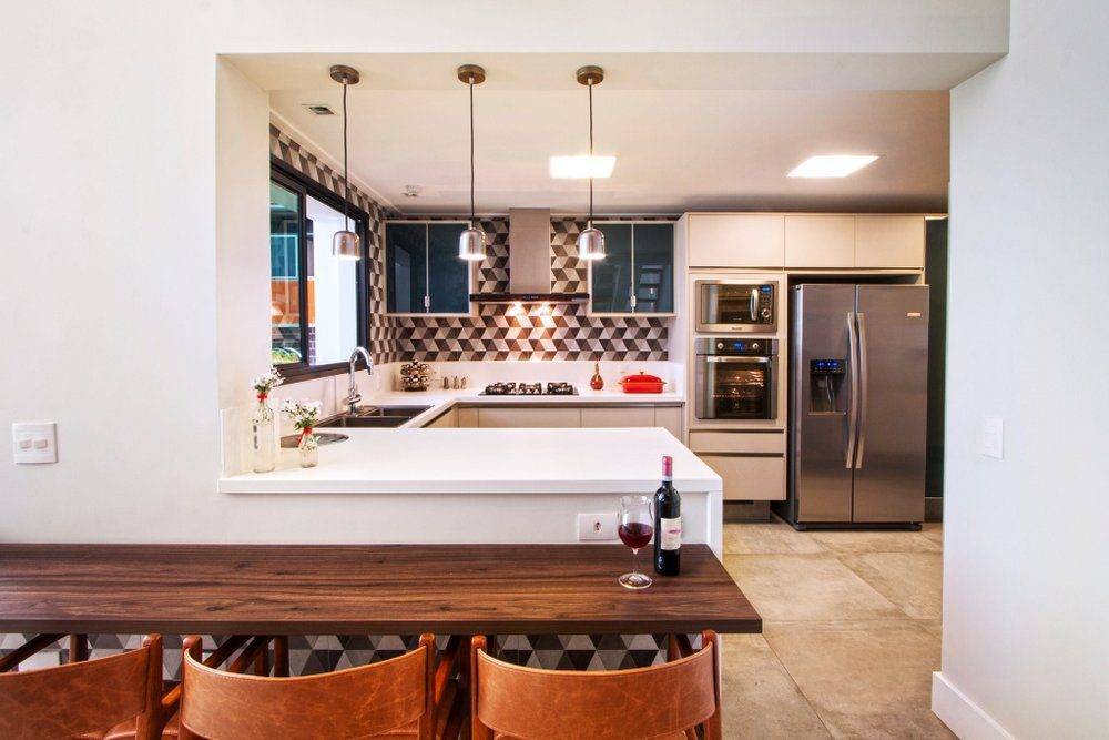 Принимая во внимание, что во фьюжн-дизайне есть современная направленность, можно вместо обычного стола использовать остров или барную стойку. Их можно задействовать и в качестве дополнительных рабочих поверхностей