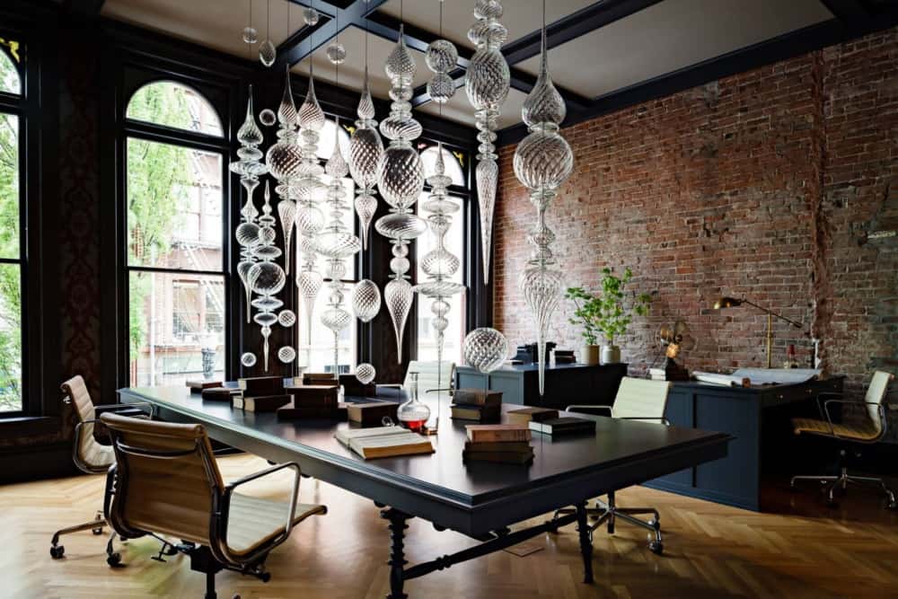 Но основное местоположение светильников — свисающие с потолка. Хорошо смотрятся подвесные металлические светильники на кованых цепях (как в интерьере лофт). Однако освещение должно быть рассеянным и достаточно мягким.