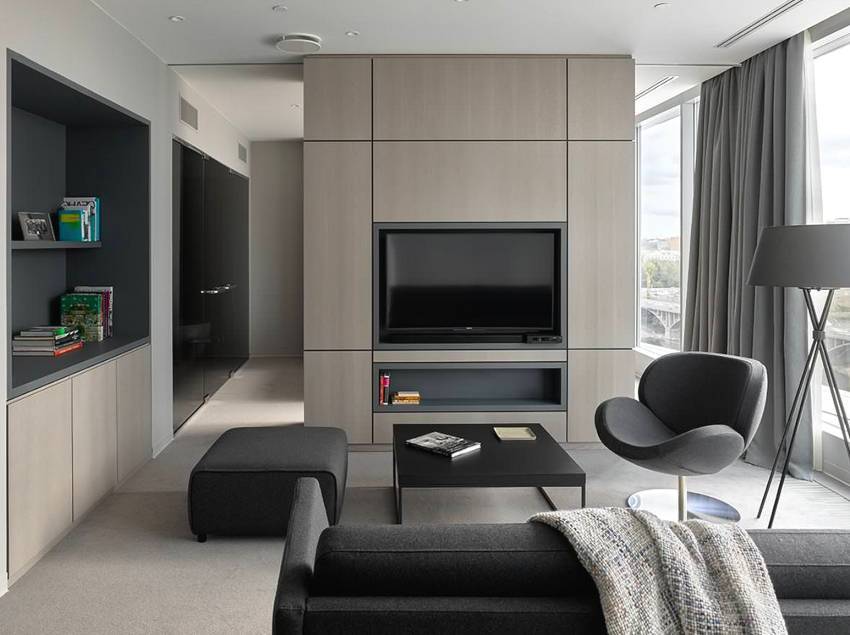 Лучший вариант для стиля минимализм — это мебель-трансформер, например, диван-кровать, вмонтированный в стену шкафа-купе. Такие конструкции экономят пространство. С этой же целью очень часто используется встроенная бытовая техника.