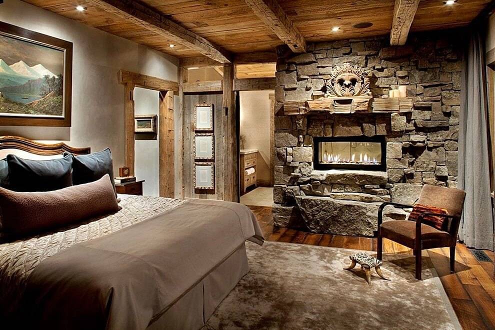 Зачастую древесина в таком интерьере соседствует с натуральным камнем. Причём это не гладкий мрамор или гранит, а необработанный сланец или песчаник. Им покрываются стеновые поверхности, декорируется очаг, выкладываются полы.
