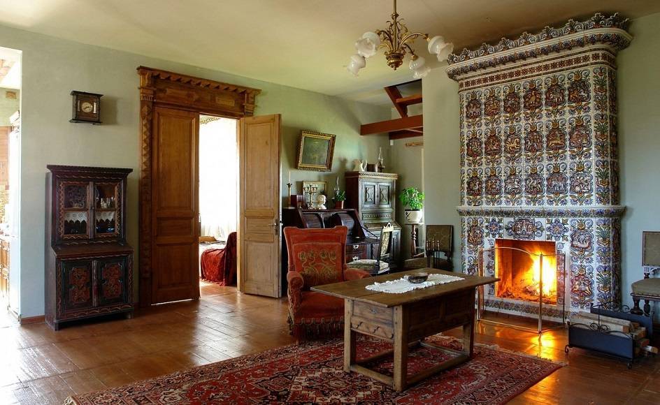 - Печка или камин. Центральный элемент всего интерьера в прошлом был одним из самых важных предметов жизни на Руси. Сейчас его легко можно заменить декоративным или настоящим камином с росписью в народном стиле.