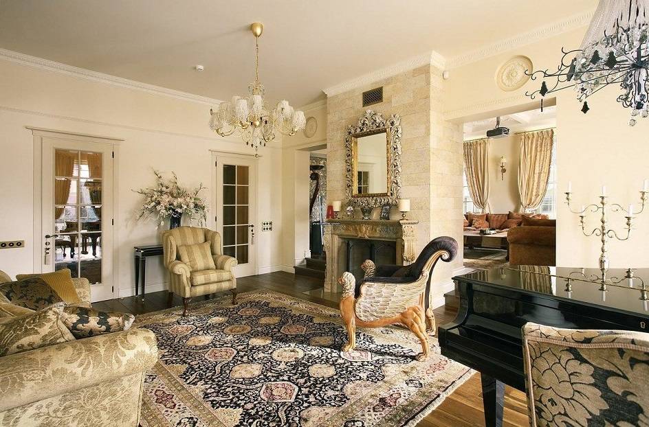 Стиль имеет множество объемных деталей, потому его предпочтительно применять в просторных, светлых квартирах, частных домах.