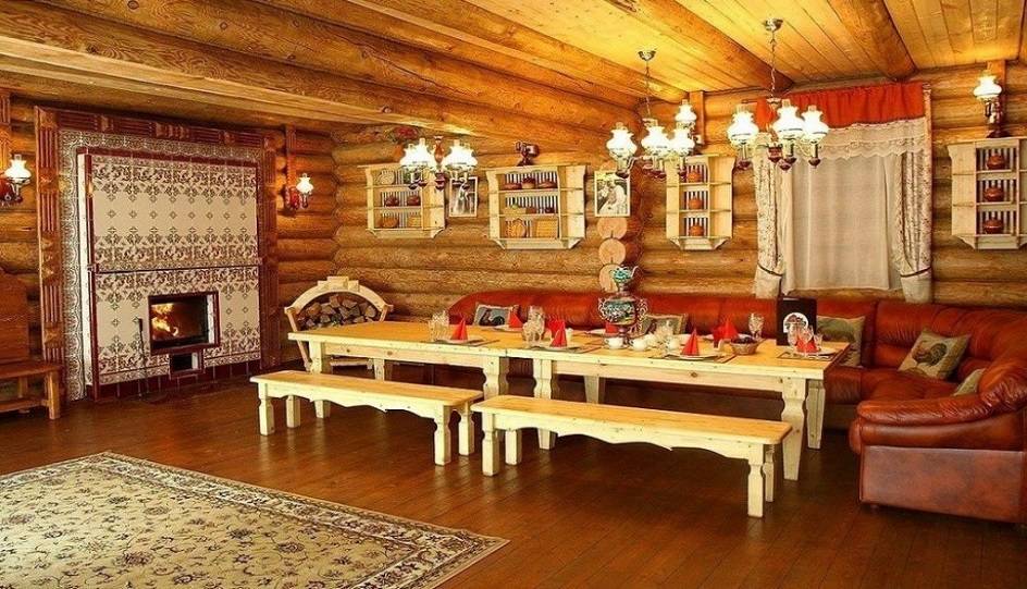 - Натуральная древесина. Используется в большом количестве, как в роли отделочного материала, так и служит основой для всей мебели в помещении. Важная особенность: красное дерево или палисандр не свойственны русскому стилю в отличие от традиционных пород (сосна, дуб, береза, ясень).