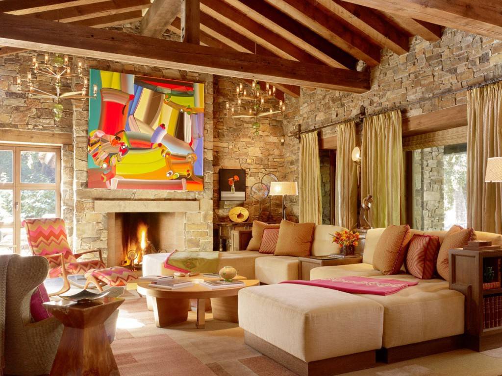 - Преобладание натуральных материалов: камня, дерева;
