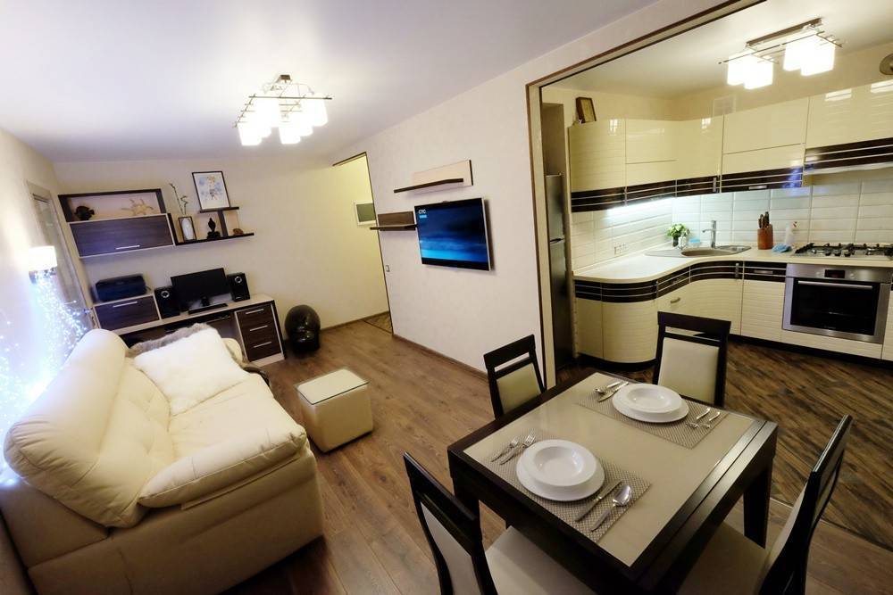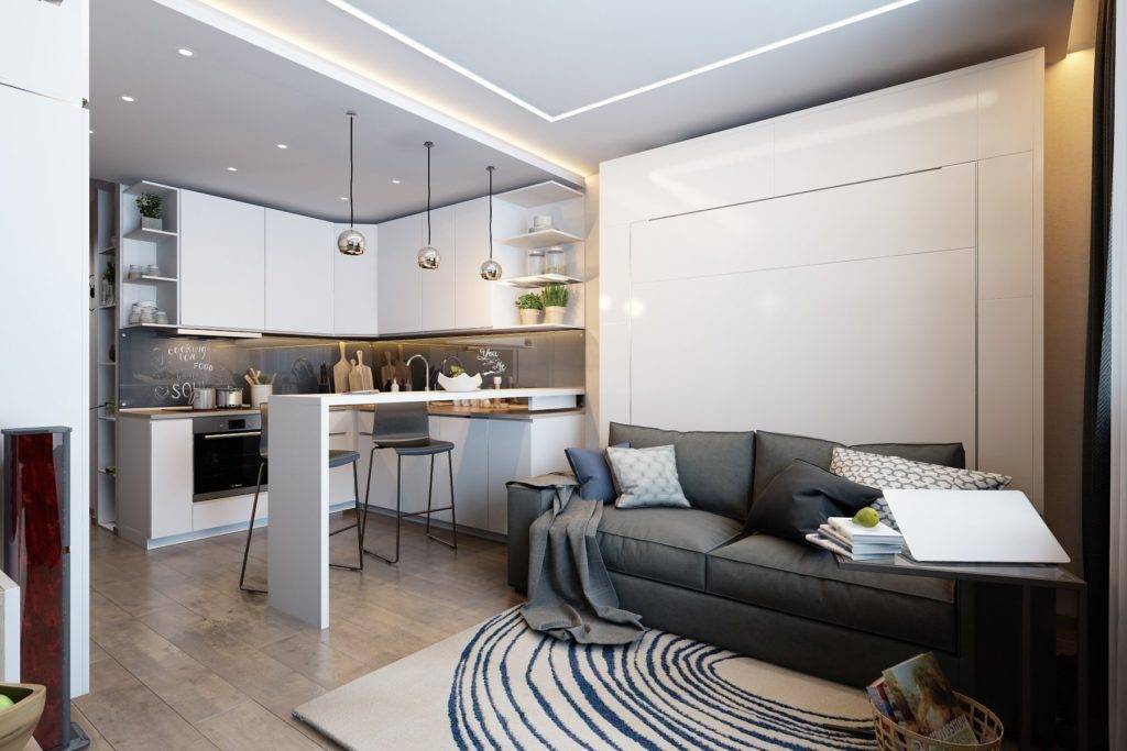 В проектировке квартиры 40 кв., гостиная может представлять собой часть кухни и быть отделенной с помощью перегородки, барной стойки или являться отдельной полноценной комнатой с диваном, телевизором, аудиосистемой, креслами, пуфами и прочим.