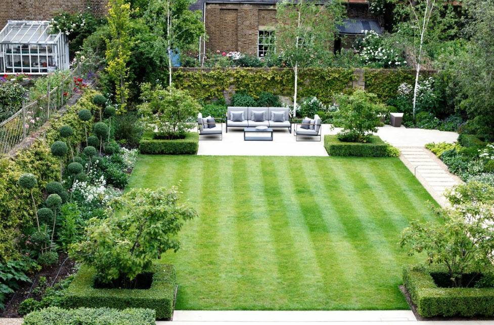 Хозяева всегда гордятся аккуратным газоном, который отлично дополняется цветниками и иными насаждениями. По идеальному английскому газону ходить не желательно, для его устройства высаживают смесь травы с очень тонкими стебельками. Многократные стрижки помогают достичь идеальной поверхности.