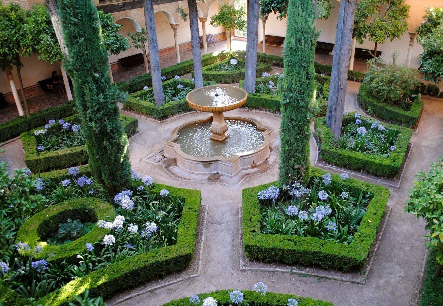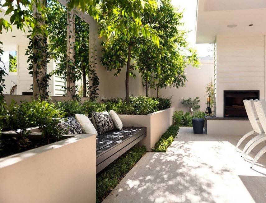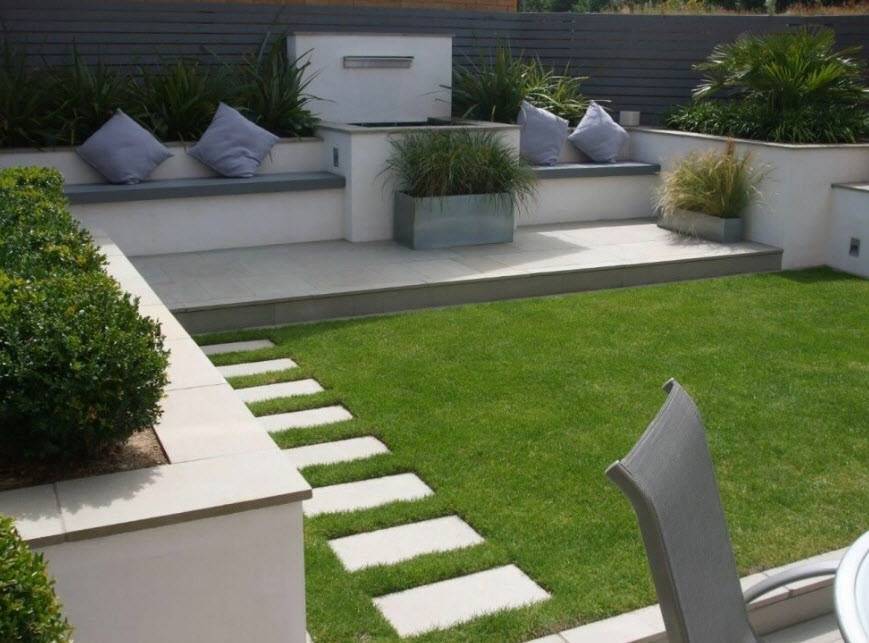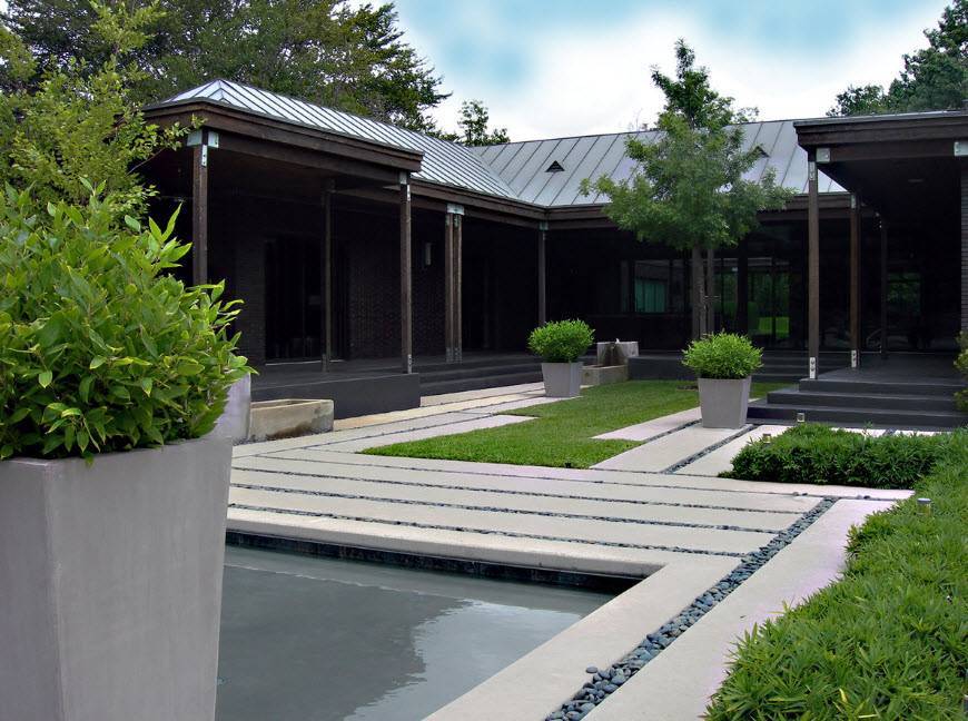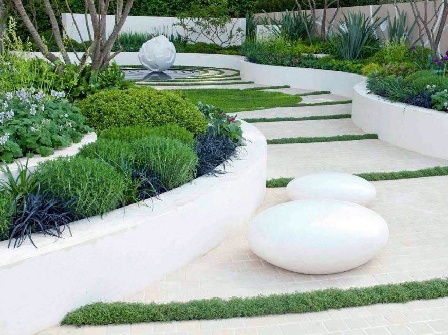 - необходимы строгие формы, но это не значит, что в саду должна царить симметрия и регулярность. Садовые дорожки делают прямыми, стиль диктует отказ от многочисленных хозяйственных построек, а патио, лестницы и подиумы, наоборот, приветствуются;