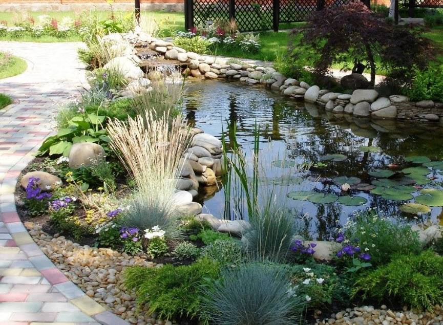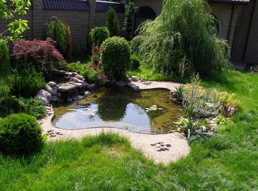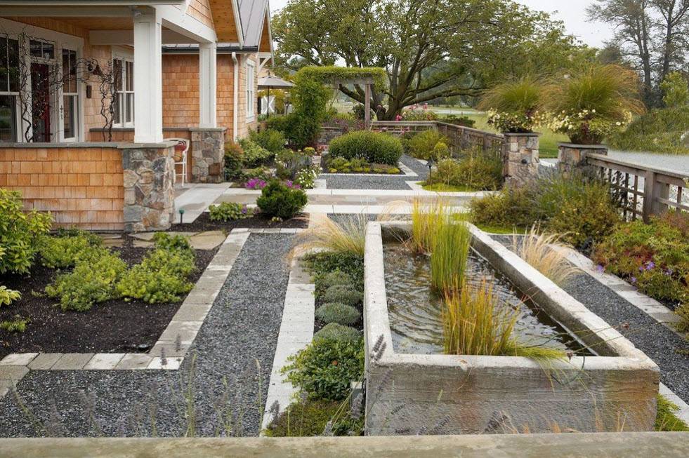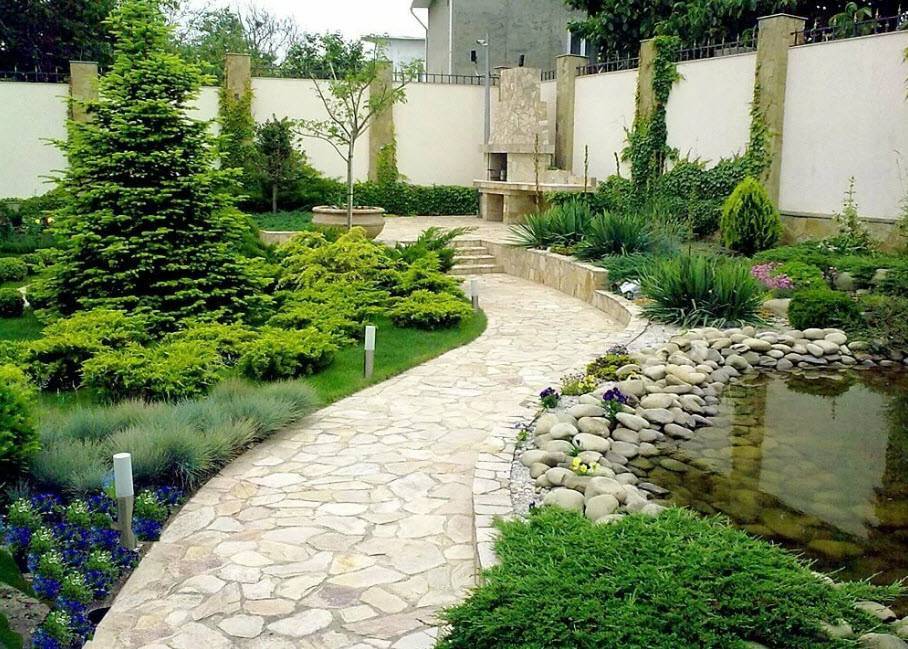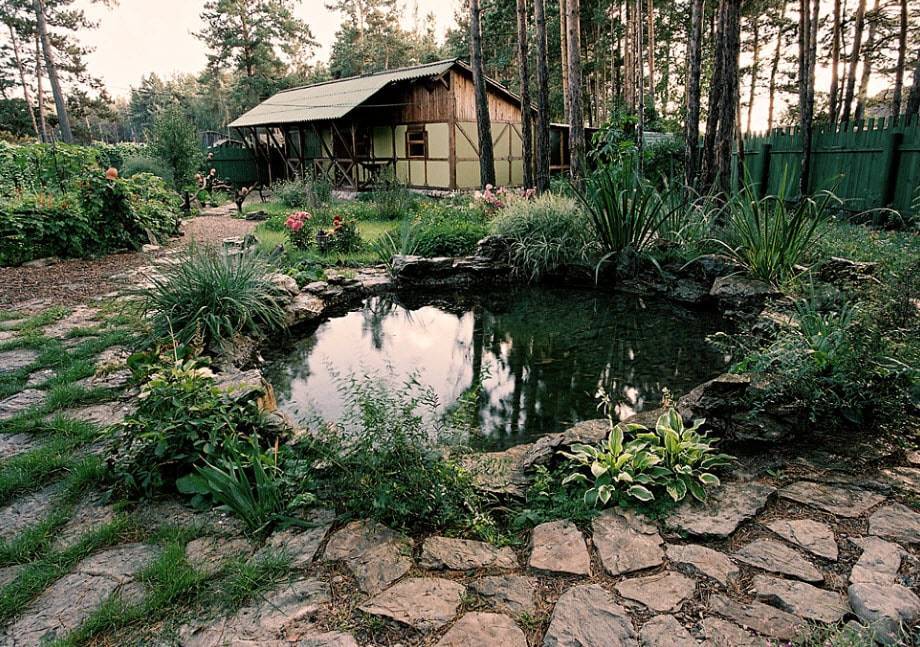 Очень часто общую картину приусадебного участка дополняют естественные водные объекты, хотя не исключением являются и искусственные, но созданные по примеру первых. В качестве декораций для водоемов могут быть высокие деревья, околоводные растения, берега с песком. Дорожки могут быть выложены камнем натуральным или подобным ему, а вдоль по обыкновению высаживаются небольшие кустарники.