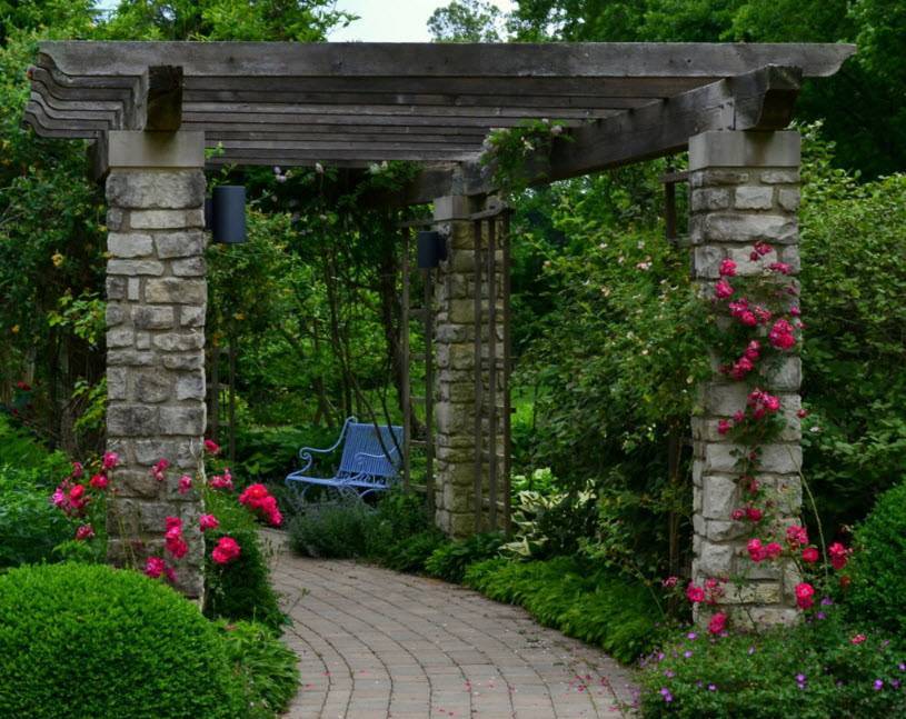 В качестве вспомогательных элементов используют арки, перголы, заборы или беседки. Дизайнеры для озеленения рекомендуют в первую очередь плющ вьющийся или виноград.