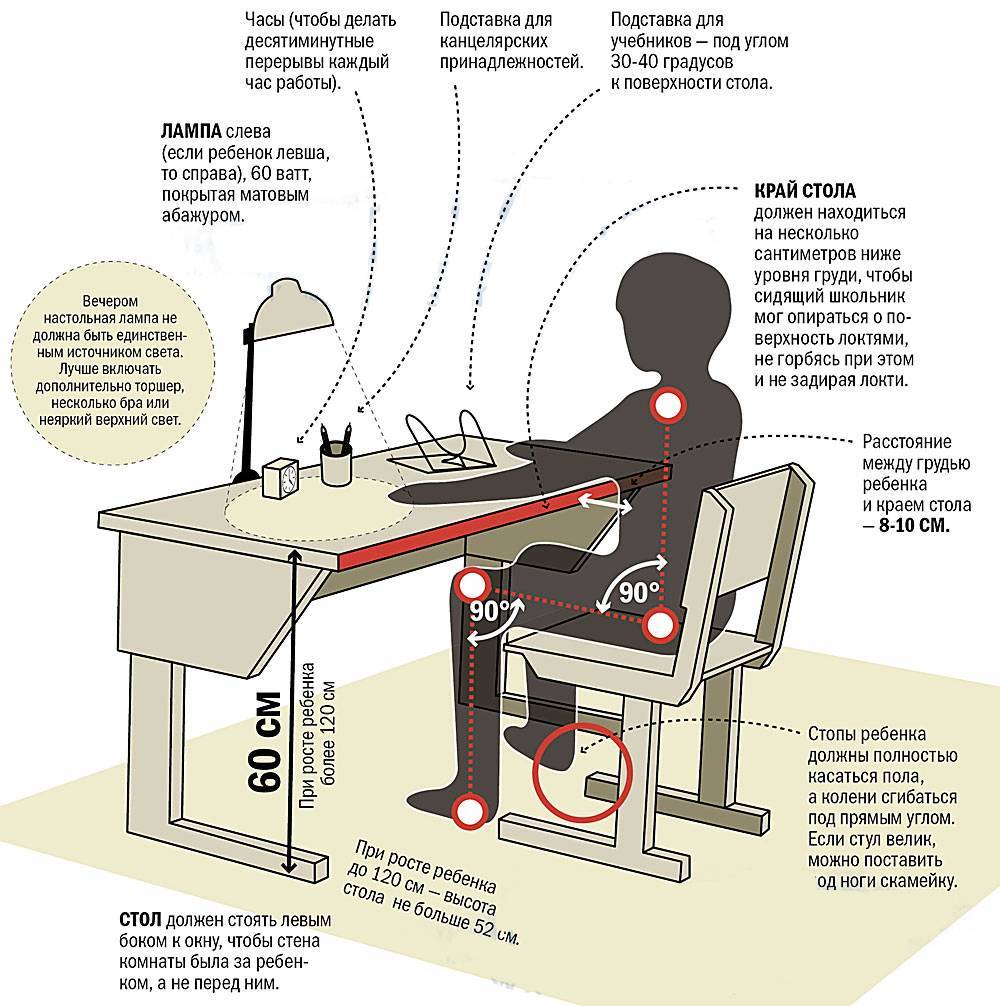 При работе край стола должен находиться на уровне солнечного сплетения ребенка. А ведь дети, как известно, растут. Ежегодная покупка столов нужной высоты, пусть некритично, но бьет по бюджету семьи. Лучше всего купить хороший анатомический стул с регулируемой высотой.