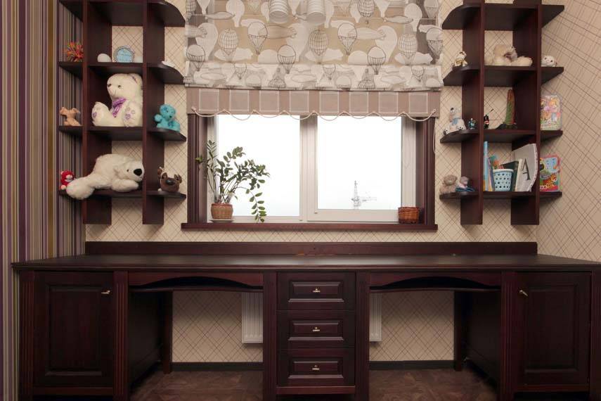 Часть стола, которая соприкасается с прилегающей стеной, обычно добавляется пеналом, открытыми полками, что очень удобно для размещения книг и сувениров. На нижние полки можно размещать принтер от компьютера, системный блок. Такая детская мебель у окна смотрится как единый ансамбль, она является отправной точкой для раскрытия концепции дизайна помещения.