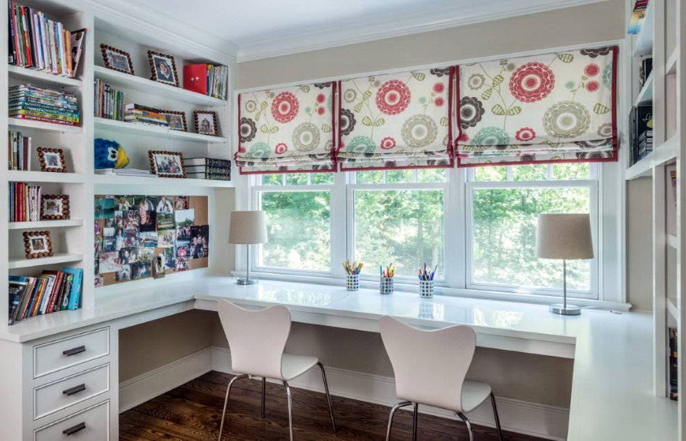 Чтобы каждому ребёнку в семье было удобно, необходимо сделать два рабочих места. В целях экономии пространства возможно использование широкого подоконника вместо обычного деревянного письменного стола.