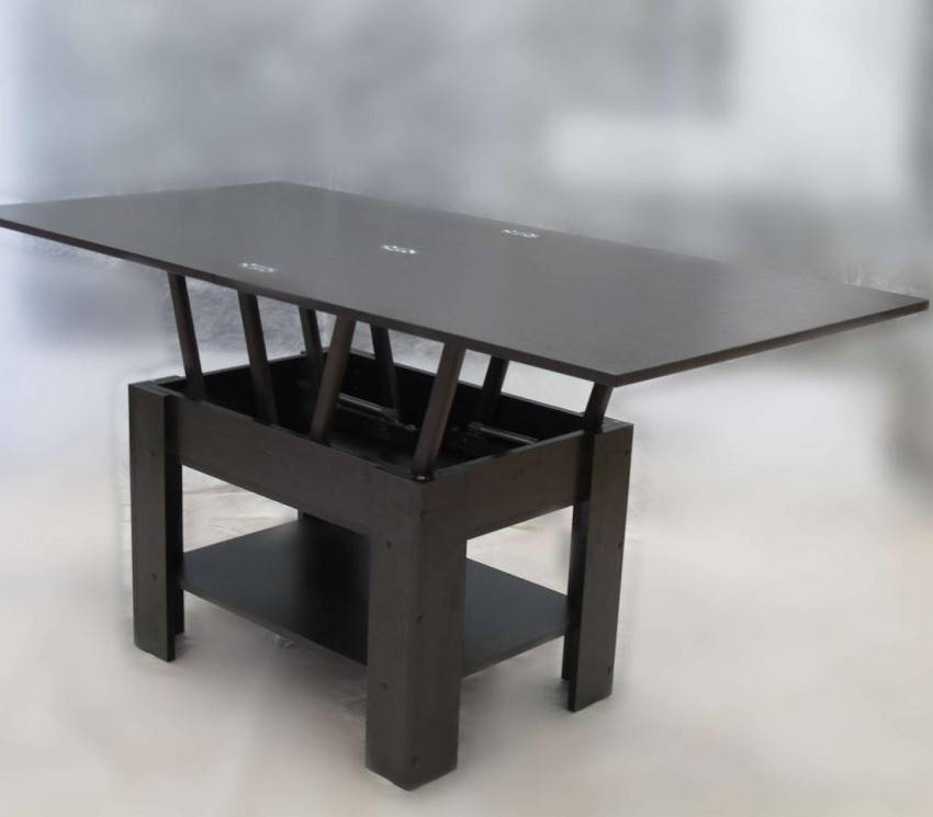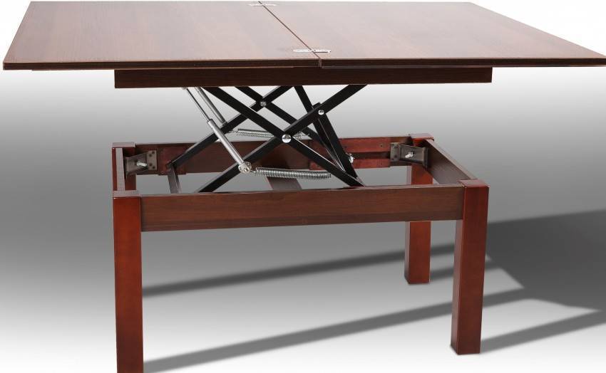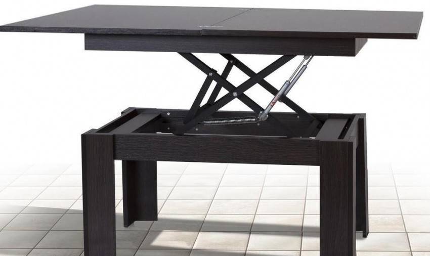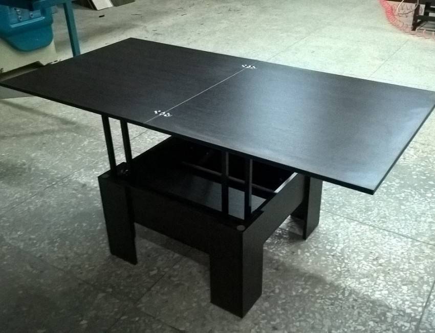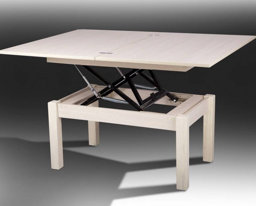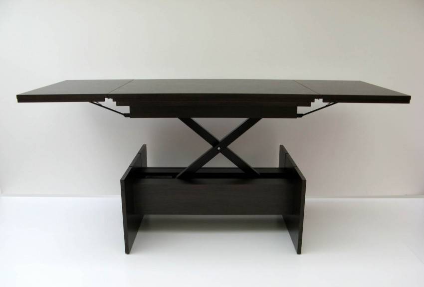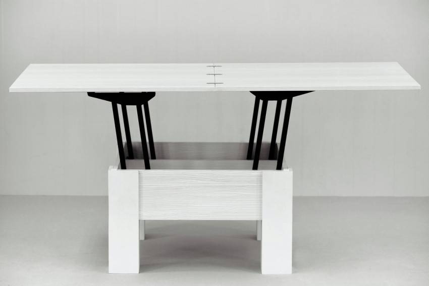 - При помощи установленного механизма подъема увеличивается высота, столешница раскрывается как книжка.