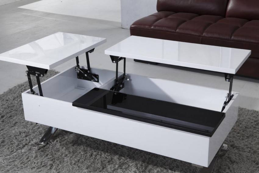 На фото журнальный стол с поднимающимся элементом столешницы. Глянцевые белые поверхности красиво смотрятся в комбинации с натуральным деревом.